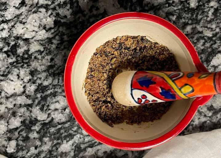 В ступке разомните ягоды можжевельника, ¾ чайной ложки кошерной соли и темно-коричневый сахар.
