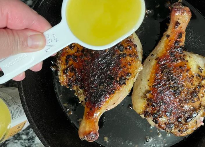 Куриный бульон больше похож на бульон из мяса птицы, но подойдет и овощной. Барретт отмечает, что мясо хорошо прожарится и приобретет насыщенный вкус и текстуру, а использование утиного жира сделает блюдо еще более сочным. Поэтому, возможно, стоит уменьшить количество уксуса в приправе, чтобы компенсировать эту разницу.