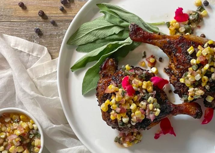 Барретт объясняет, как она подбирала ингредиенты: «Сосновый аромат жареного можжевельника и вкус патоки из темно-коричневого сахара нуждаются в контрасте. Насыщенный вкус утки оттеняется острым вкусом свежей кукурузы и терпким уксусом в приправе. Шалфей придает блюду травянистый оттенок». Контрастные ингредиенты объединяются в единое целое, подготавливая вкусовые рецепторы к взрыву вкуса. Здесь и так много всего, так что дополните утку зеленым салатом, запеченным картофелем или пюре — получится простой гарнир, который завершит трапезу.