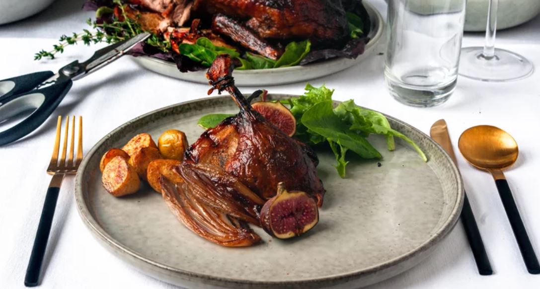 Утка — это темное мясо, так что если вы из тех, кто с удовольствием набрасывается на куриную или индюшачью голень, этот рецепт для вас уравновешивает жирность утки запеченными фруктами, а благодаря луку-шалоту и молодому картофелю блюдо готовится практически без использования духовки.