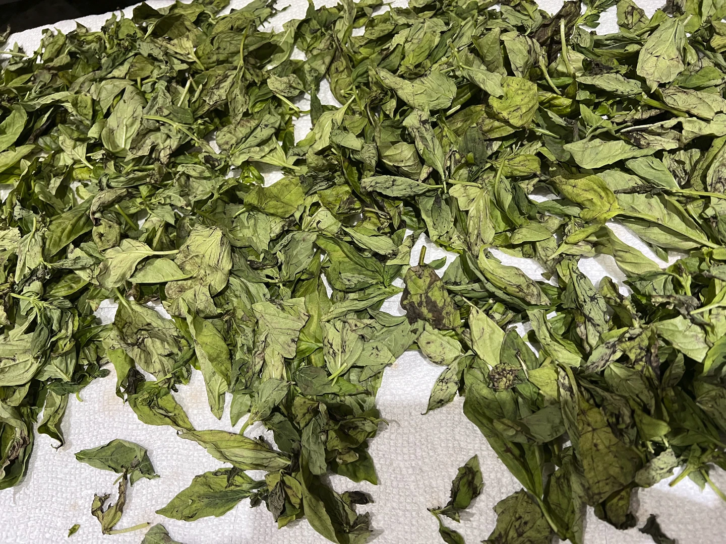 Промойте, отделите от стеблей и разложите в один слой на чистых полотенцах для просушки. Поскольку цель состоит в том, чтобы высушить листья, а не просто удалить лишнюю влагу, процесс займёт значительно больше времени. Ежедневно переворачивайте листья. Когда они станут хрустящими, переложите их в чистые банки или другие герметичные контейнеры и храните так же, как сушёные травы из магазина.