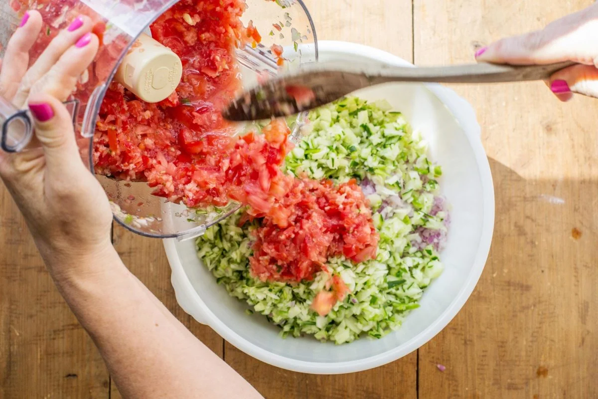 Порядок, в котором измельчаются ингредиенты, не имеет значения. Просто убедитесь, что вы измельчили халапеньо вместе хотя бы с одним из нарезанных кубиками овощей, чтобы всё хорошо перемешалось. Вы можете измельчать овощи крупно или до получения однородной массы, а также добавлять больше или меньше томатного сока по своему вкусу. Гаспачо — это очень индивидуальный баланс между вкусом и текстурой.