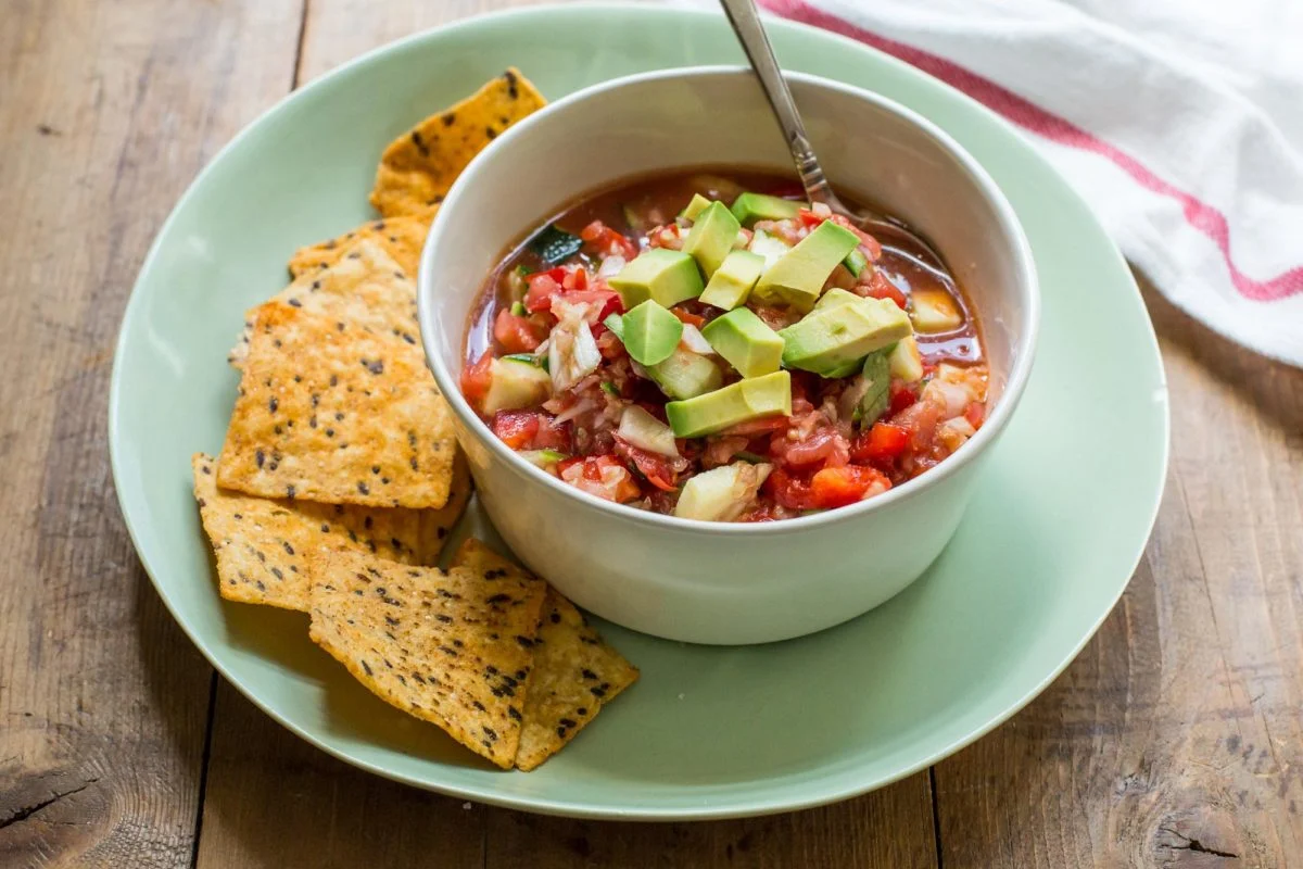 Гаспачо — это холодный овощной суп-пюре, который часто готовят с помидорами. Он родом из Испании и также очень популярен в Португалии. В то время как некоторые приверженцы традиций измельчают всё вручную, если у вас есть кухонный комбайн или блендер, вы на верном пути. Помидоры обычно являются основой этого супа, к ним часто добавляют огурцы, что-нибудь из семейства луковых и, возможно, немного зелени.