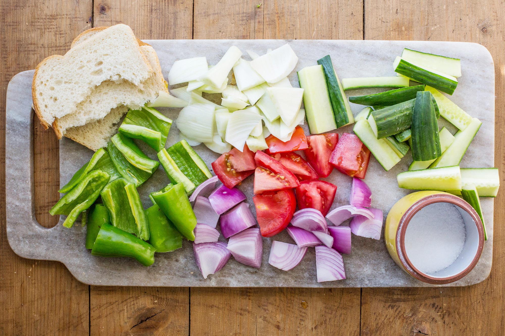 В чаше кухонного комбайна или блендера смешайте лук-шалот с луком и измельчите до состояния мелкой крошки, но НЕ в пюре! Переложите в миску. Положите в кухонный комбайн огурец, фенхель и острый перец и сделайте то же самое, затем добавьте их к луковой смеси. Затем добавьте половину помидоров и один ломтик хлеба, измельчите и тоже переложите в миску. Наконец, измельчите оставшиеся помидоры с помощью оставшегося ломтика хлеба, добавьте их к остальным ингредиентам и перемешайте.