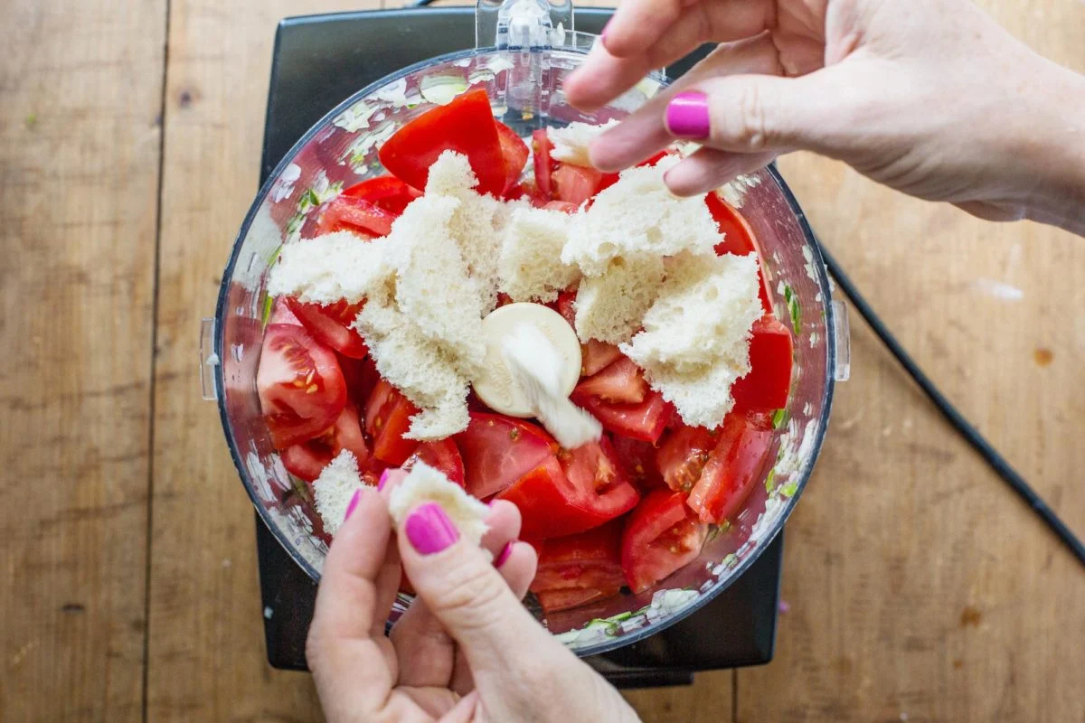 Нарежьте помидоры и хлеб: добавьте раскрошенный хлеб, чтобы он смешался с томатной основой.