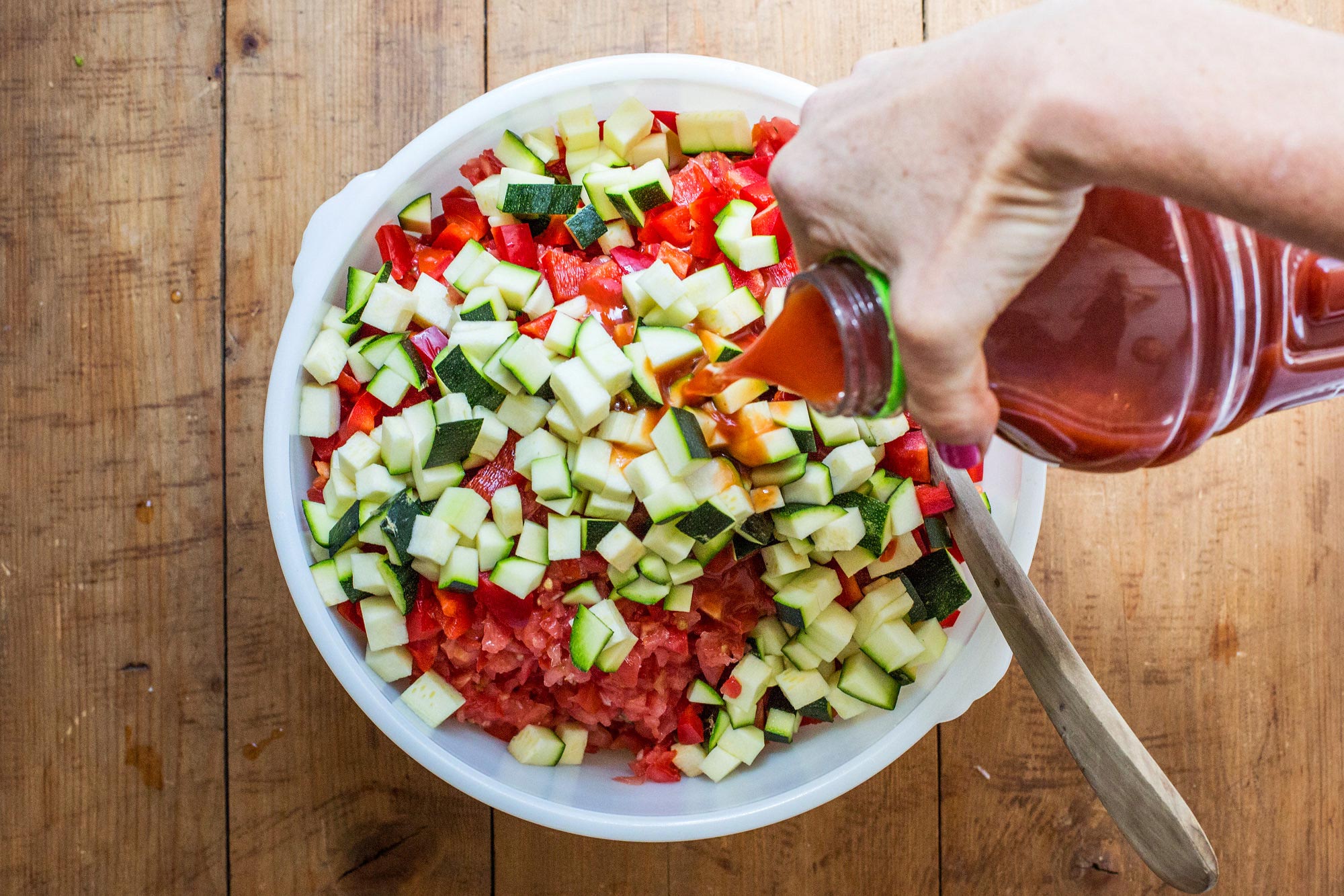 Выложите одну чашку овощной смеси обратно в кухонный комбайн, затем добавьте томатный сок, оливковое масло и уксус и приправьте солью и перцем. Измельчите смесь в пюре, затем добавьте её в миску вместе с нарезанными кубиками кабачками и болгарским перцем и перемешайте.