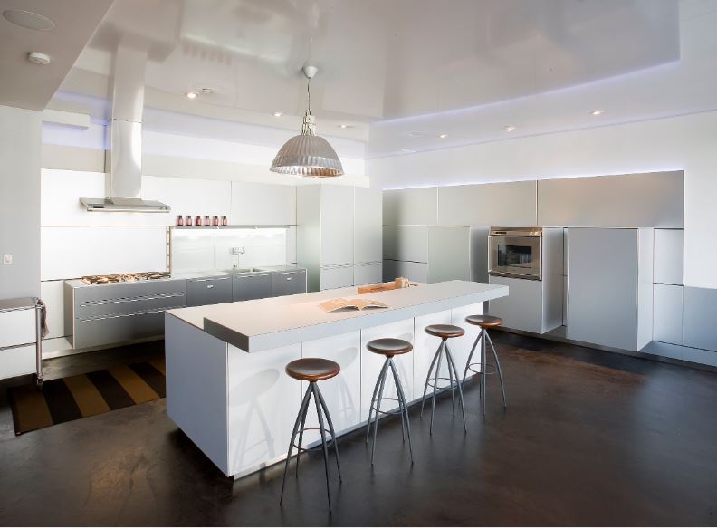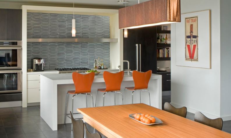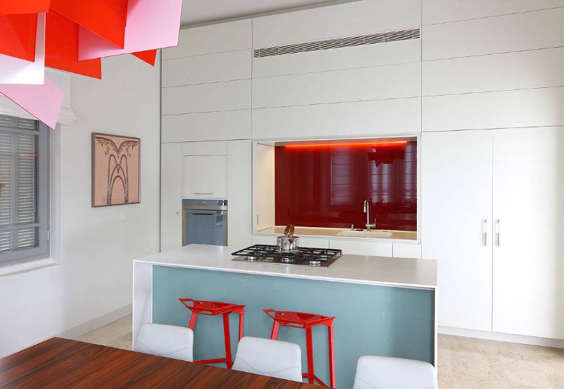 Яркий. Если вы смелый и не боитесь ярких красок, смело экспериментируйте! Здесь современный красный табурет на фоне небесно-голубого кухонного острова — прекрасный элемент в этой полностью белой кухне.