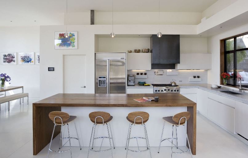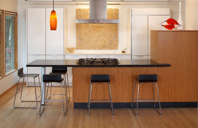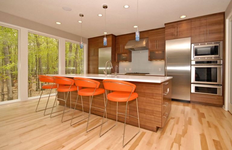 Дерево и металл. Современные табуреты, сочетающие дерево и металл, сейчас довольно популярны. Особенно эффектно эти табуреты смотрятся в минималистичной и современной кухне благодаря своей скульптурной форме.Здесь дерево и металл почти воспринимаются как цвет в этой преимущественно нейтральной кухне. В нейтральных пространствах не забывайте, что дерево тоже может быть цветом, будь то оранжевый цвет вишни или желтый цвет клена.