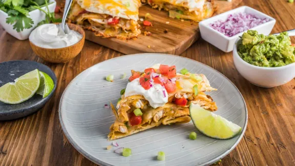 Нужен легкий ужин, так? Попробуйте кесадилью! Использование остатков курицы сокращает время приготовления до нескольких минут, так что все, что вам нужно сделать, это собрать кесадилью и запечь. Этот рецепт восхитительно сырный и сытный, благодаря курице и овощному ассорти, и он наверняка станет новым основным блюдом буднего вечера.