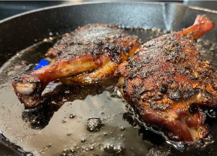Куриный бульон больше похож на бульон из мяса птицы, но подойдет и овощной. Барретт отмечает, что мясо хорошо прожарится и приобретет насыщенный вкус и текстуру, а использование утиного жира сделает блюдо еще более сочным. Поэтому, возможно, стоит уменьшить количество уксуса в приправе, чтобы компенсировать эту разницу.