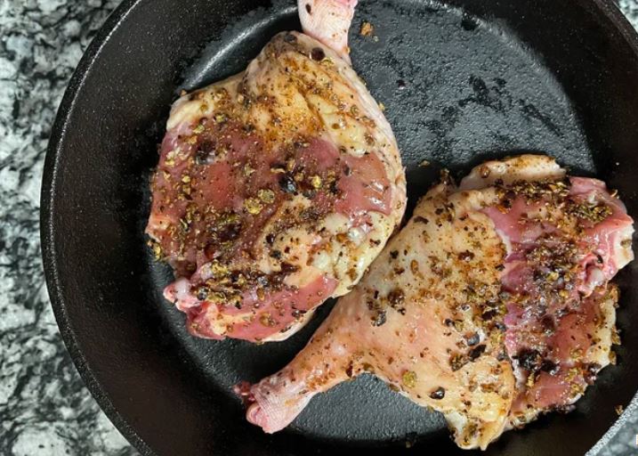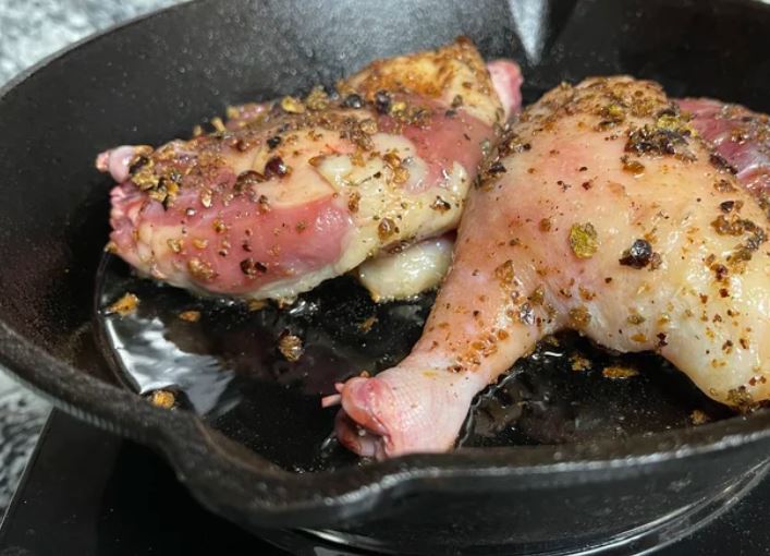 Выложите утиные ножки кожей вниз на холодную чугунную сковороду и поставьте на средний огонь.