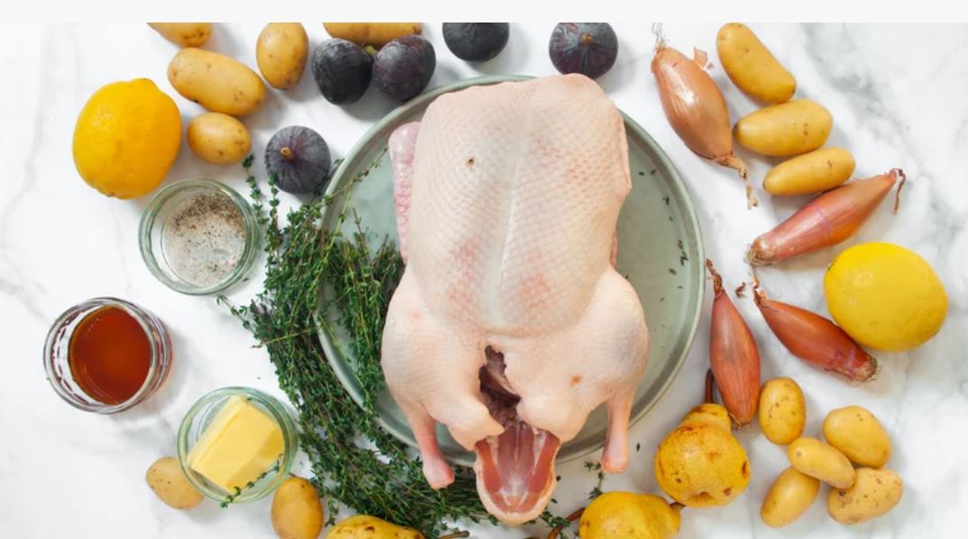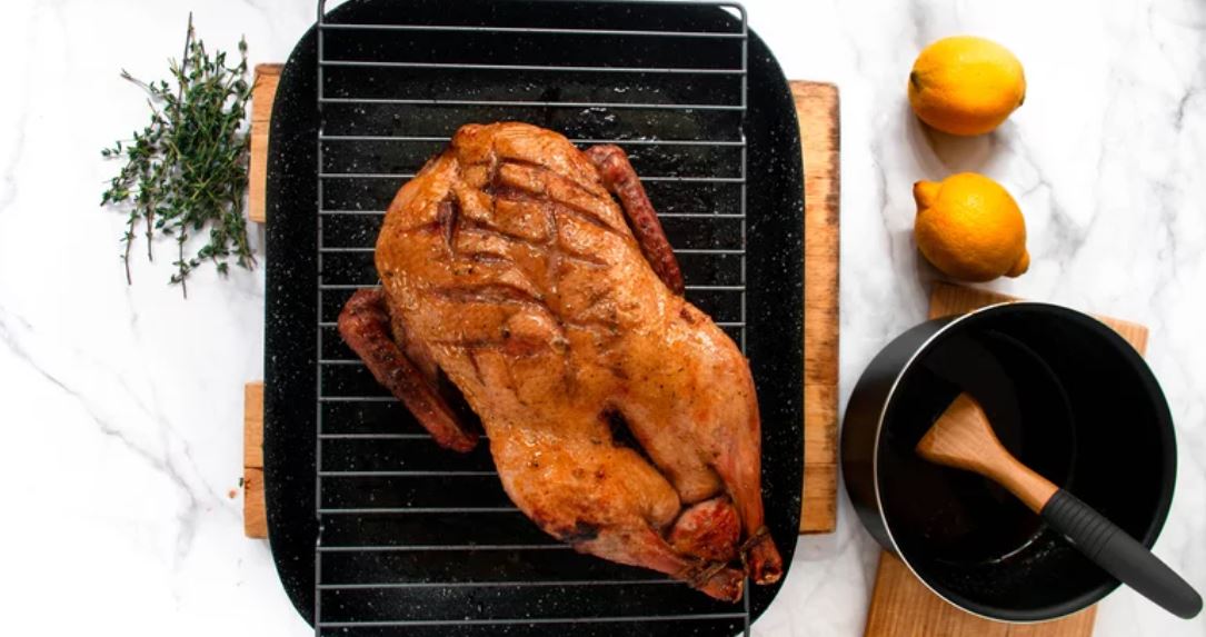 Разогрейте духовку до 230 °C. Достаньте утку из холодильника за 30 минут до начала приготовления. В рецепте также есть гарнир из запеченного мелкого картофеля, лука-шалота, свежего инжира и груш сорта Бартлетт. Сначала запеките их, а затем разогрейте, когда утка будет готова.
