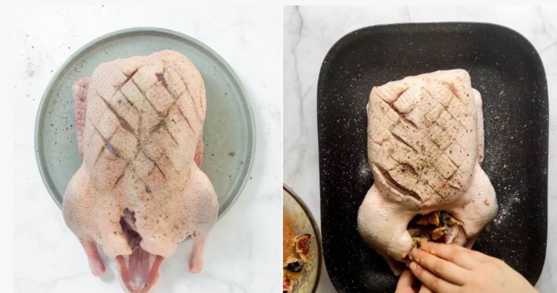 Утка славится большим количеством жира, который вытапливается при жарке. Чтобы жир вытапливался как можно сильнее (и кожа при этом стала хрустящей), нужно сделать на утке надрезы. Но сначала проверьте, нет ли на коже утки оставшихся перьев. Если вам нравится хрустящая корочка, рекомендуем взять пинцет и удалить их.