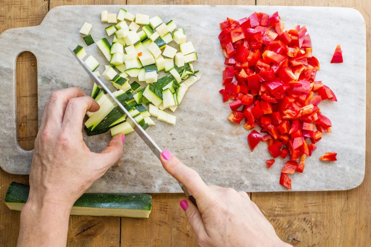 Вы, конечно, можете измельчить все овощи в кухонном комбайне, а не нарезать их вручную, и получить отличный гаспачо. И вы, конечно, можете нарезать все овощи вручную, если хотите получить более однородное и красивое гаспачо. Однако это занимает много времени, поэтому можно пойти на компромисс (который мне нравится) и нарезать один или два овоща, особенно те, которые легко нарезать аккуратно, например, кабачки и болгарский перец.