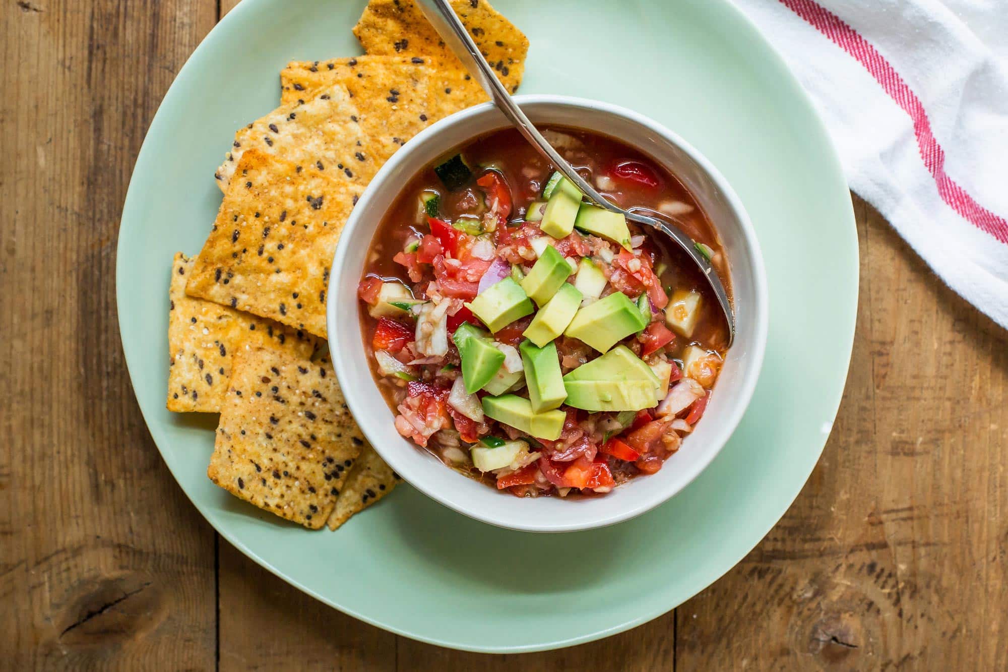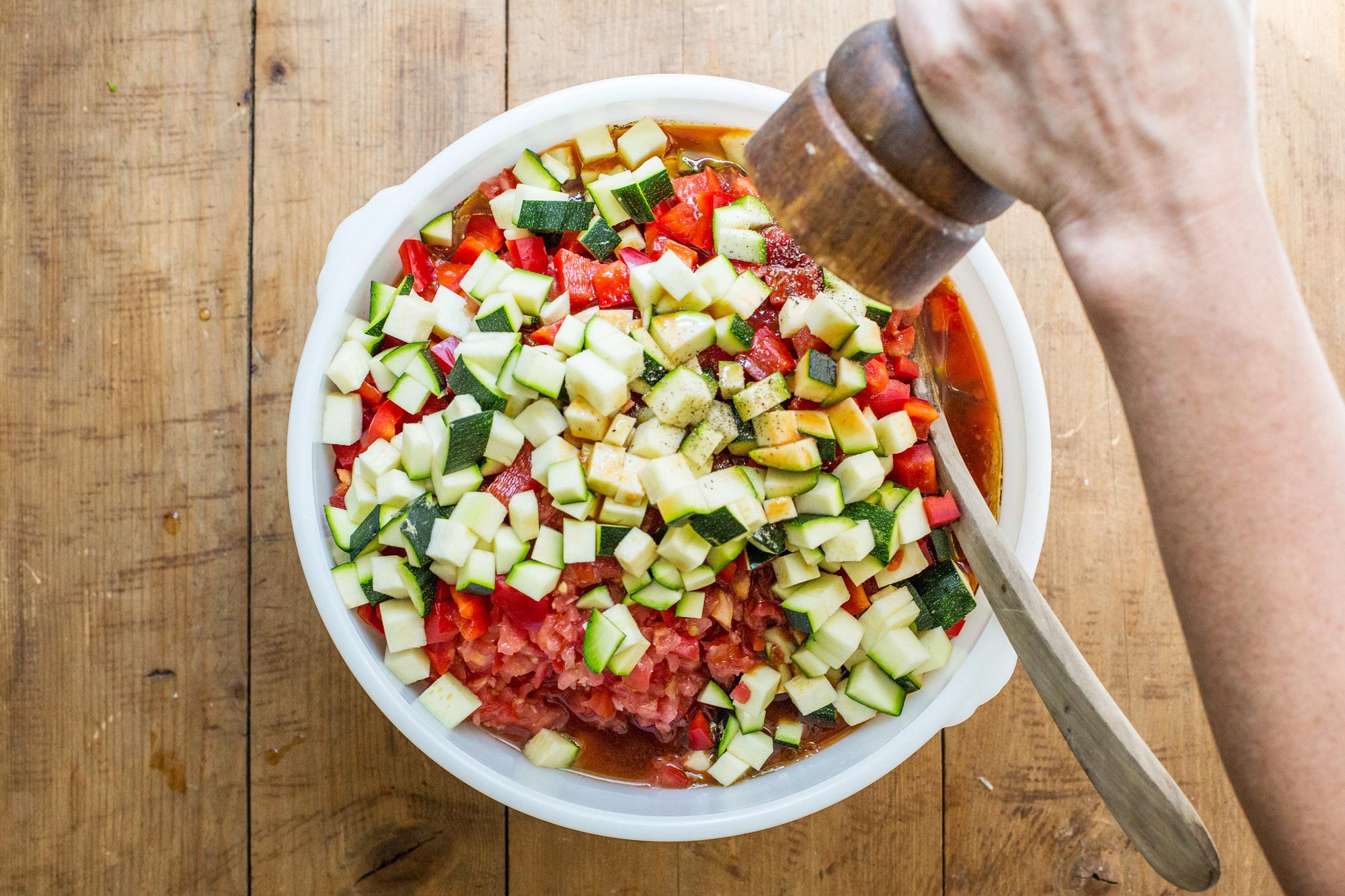 Вы, конечно, можете измельчить все овощи в кухонном комбайне, а не нарезать их вручную. И вы, конечно, можете нарезать все овощи вручную, если хотите, чтобы гаспачо было более однородным и красивым. Однако это занимает много времени, поэтому можно пойти на компромисс (который мне нравится) и нарезать один или два овоща, особенно те, которые легко нарезать аккуратно, например, кабачки и болгарский перец.
