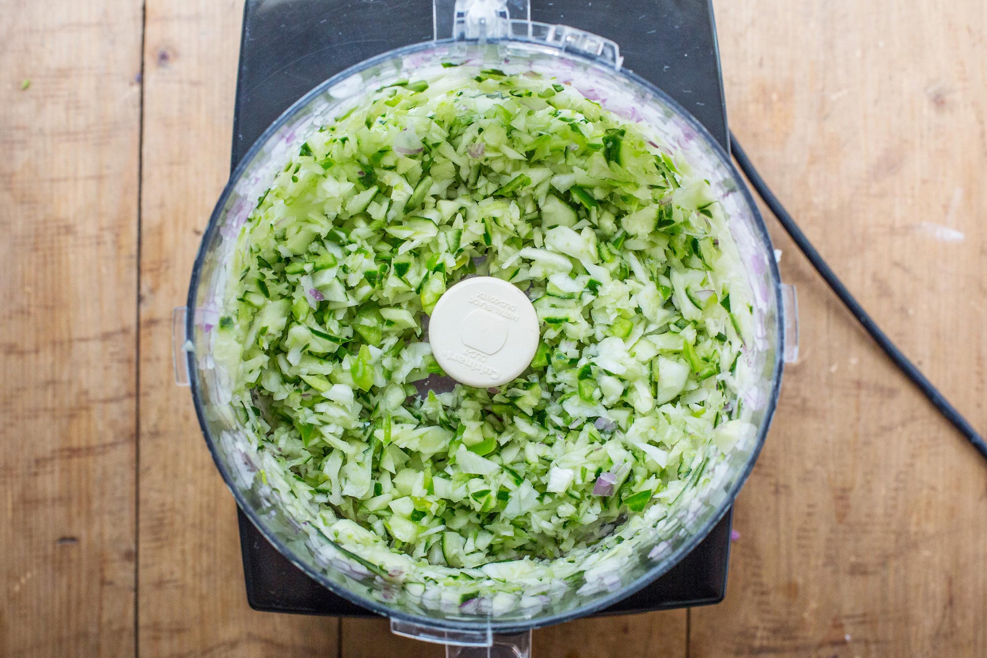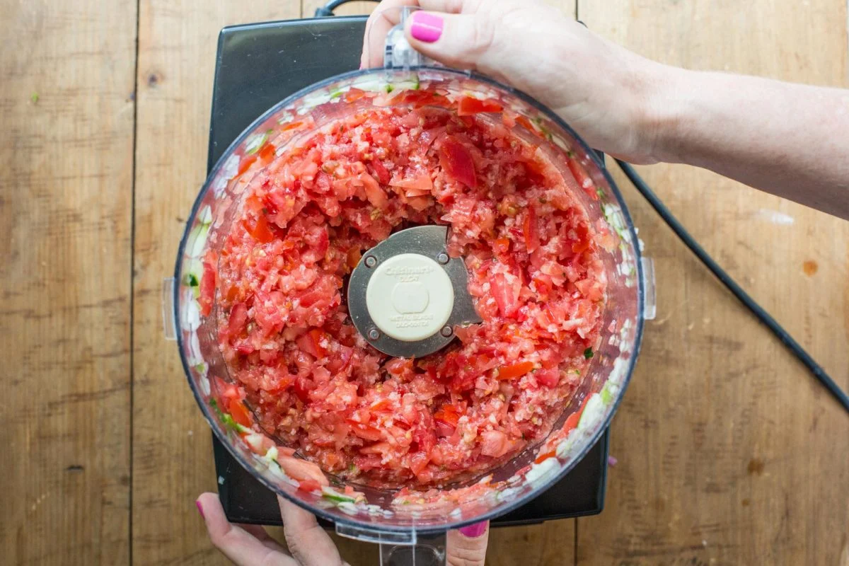 Порядок, в котором измельчаются ингредиенты, не имеет значения. Просто убедитесь, что вы измельчили халапеньо вместе хотя бы с одним из нарезанных кубиками овощей, чтобы всё хорошо перемешалось. Вы можете измельчать овощи крупно или до получения однородной массы, а также добавлять больше или меньше томатного сока по своему вкусу. Гаспачо — это очень индивидуальный баланс между вкусом и текстурой.