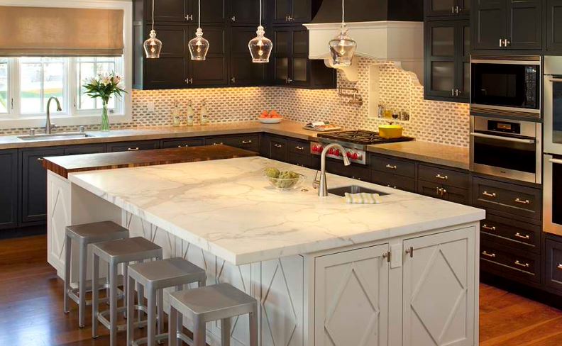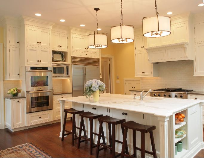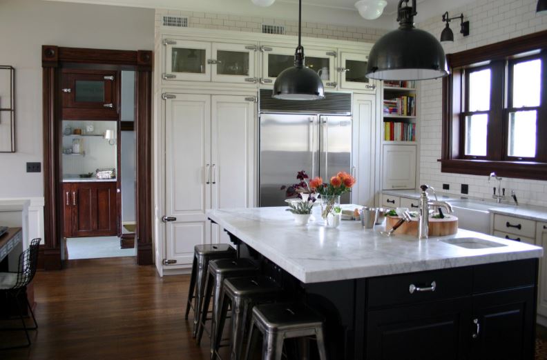 Металл. Это очевидный выбор для барных стульев на кухне, потому что это отличный материал, который легко чистить. Кроме того, металлические стулья часто довольно доступны по цене. Здесь металл уравновешивает все это дерево и позволяет использовать более современный подвесной светильник . Мне нравится контраст этих индустриальных и современных элементов с более традиционной мебелью. Эти стулья без спинок, поэтому они не доминируют над кухонным островом — они аккуратно убираются под выступ. Скорее всего, если бы стулья были больше, скажем, с подлокотниками или с обивкой, вы бы не смогли разместить четыре таких стула, и пришлось бы пожертвовать этой прекрасной столешницей из массива дерева.