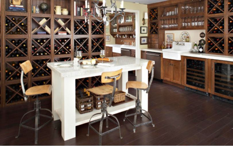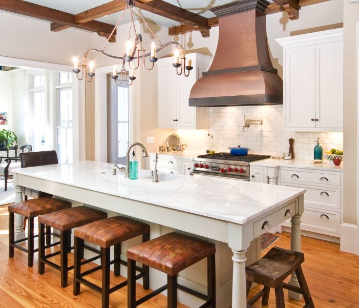 Мне нравится деревенский стиль этих деревянных плетеных табуретов, а также то, что один из них, совсем не похожий на остальные, стоит в конце кухонного острова. Теплые тона деревянных табуретов гармонируют с потолочными балками и медной вытяжкой, согревая эту в остальном очень белую кухню. Кто сказал, что табуреты должны быть одинаковыми? Выбор табуретов без спинок тоже был удачным решением, поскольку, судя по всему, они живут в довольно оживленном коридоре.